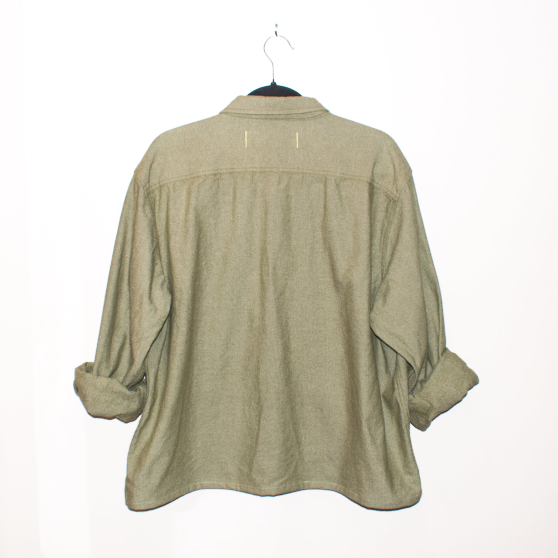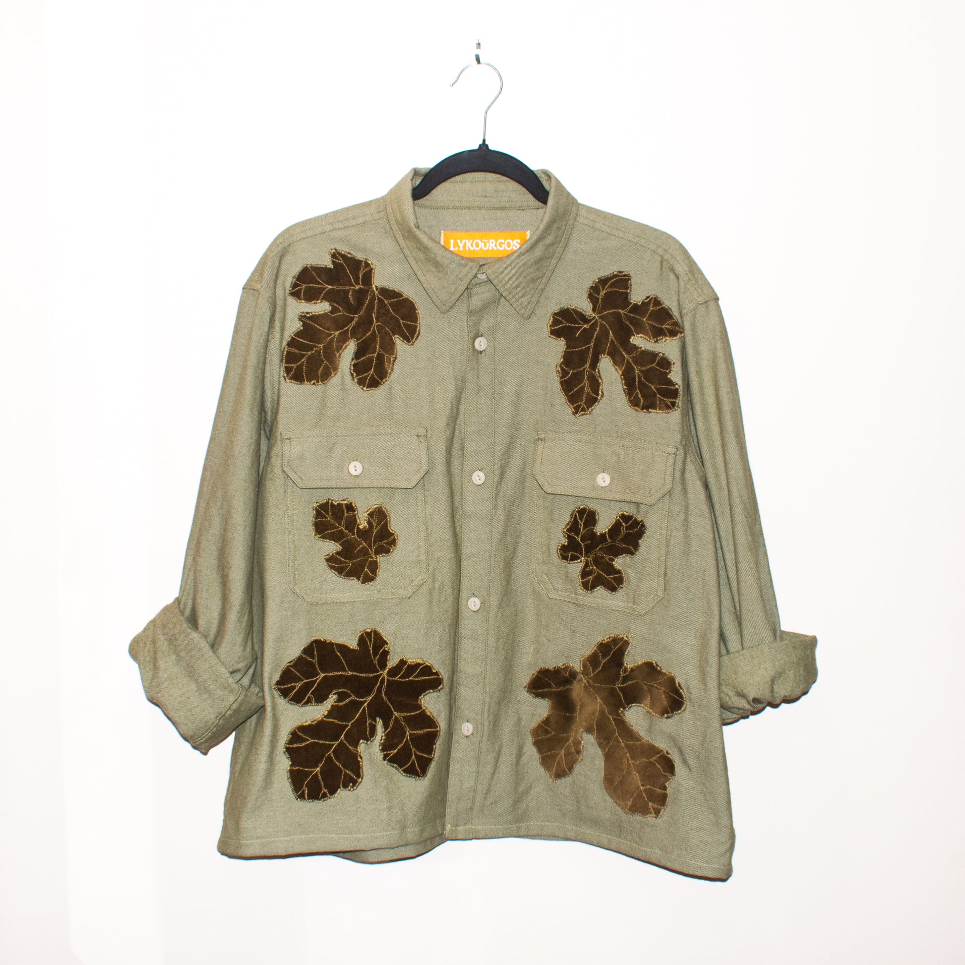 Green long-sleeve shirt w/ custom velvet fig appliqués, double front pockets