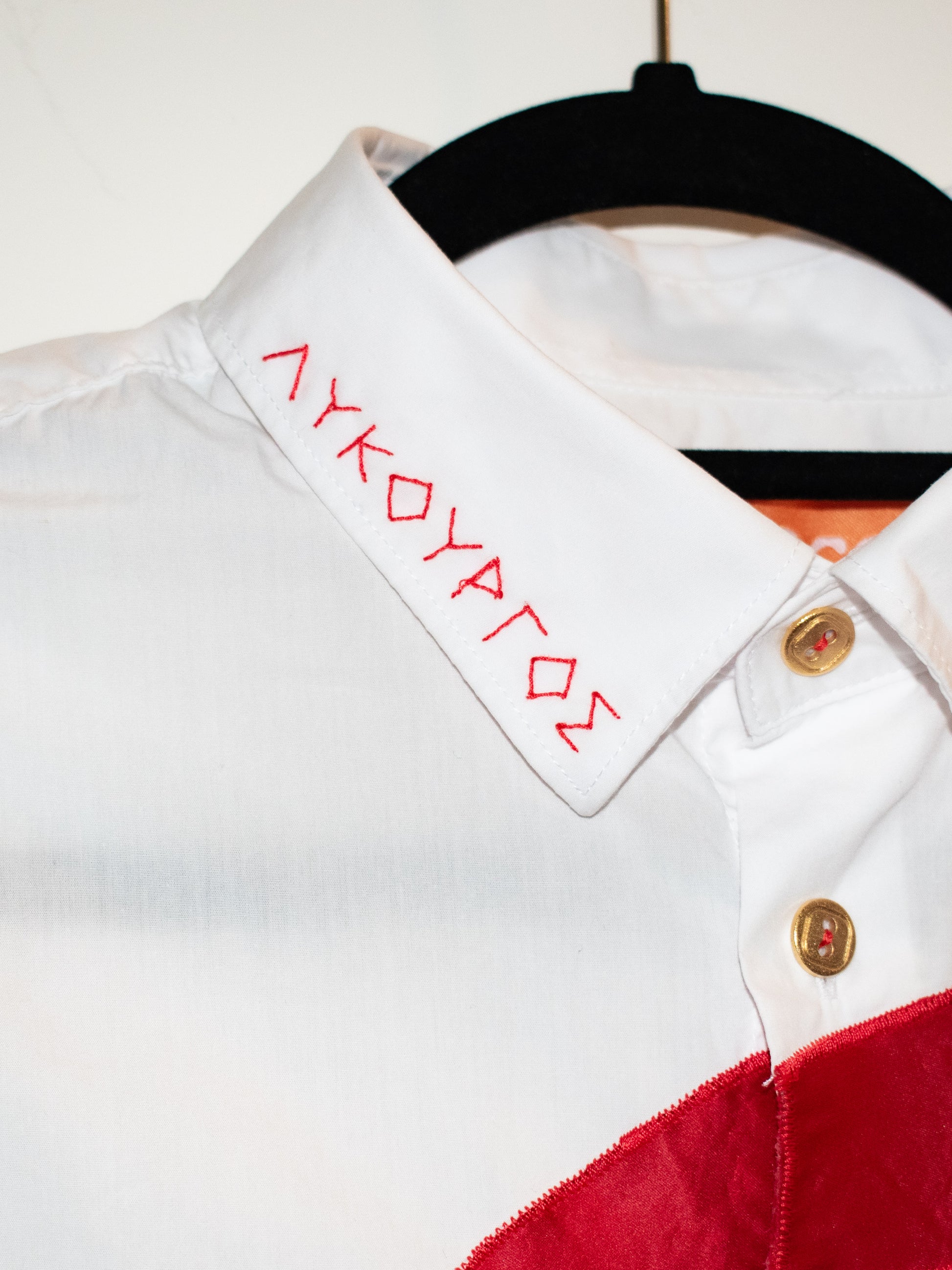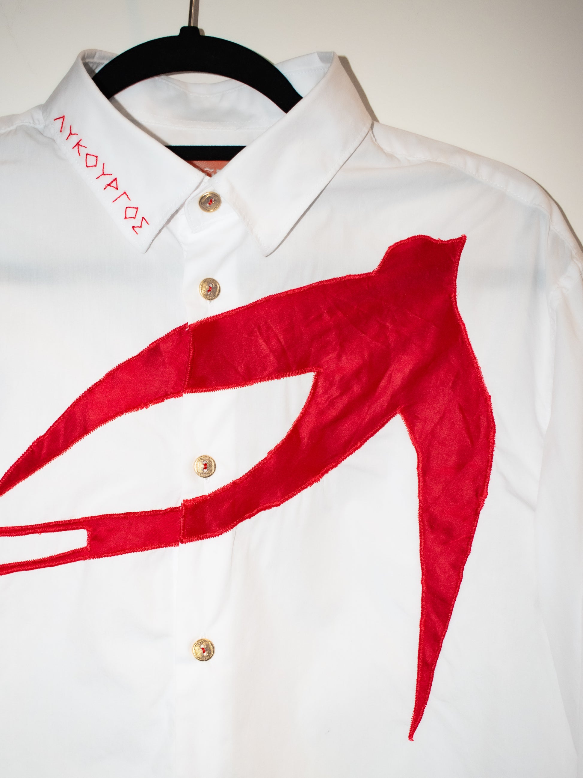 Experience an elevated white button-down - vibrant red bird motif inspired by ancient Greek pottery art, gold buttons, and hand-embroidered LYKOURGOS collar detail. Sophisticated yet playful, ancient yet modern. Designed to indulge your inner deity.
